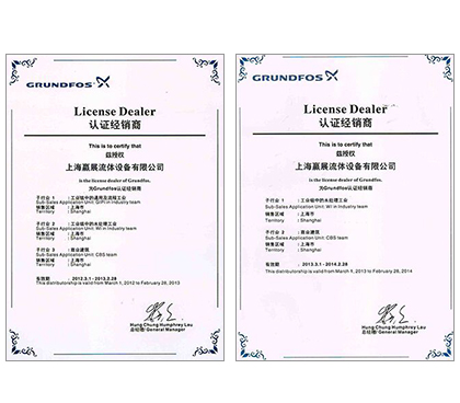 上海贏展流體設備有限公司是一家以水泵業務為主的流體設備銷售公司,2009年成立于上海。公司于2010年與格蘭富廠商正式簽訂代理協議,并取得授權代理證書;2014年格蘭富授權我司成立獨立的售后服務中心,是一家專業從事環保設備、機電設備、技術改造、安裝服務的銷售服務公司。